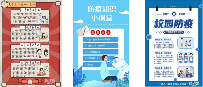 1.这是一组以防疫知识宣传为主的作品。同学们对防疫相关内容进行收集整理,通过自己的创作想法,以一种简明扼要的形式呈现出来。