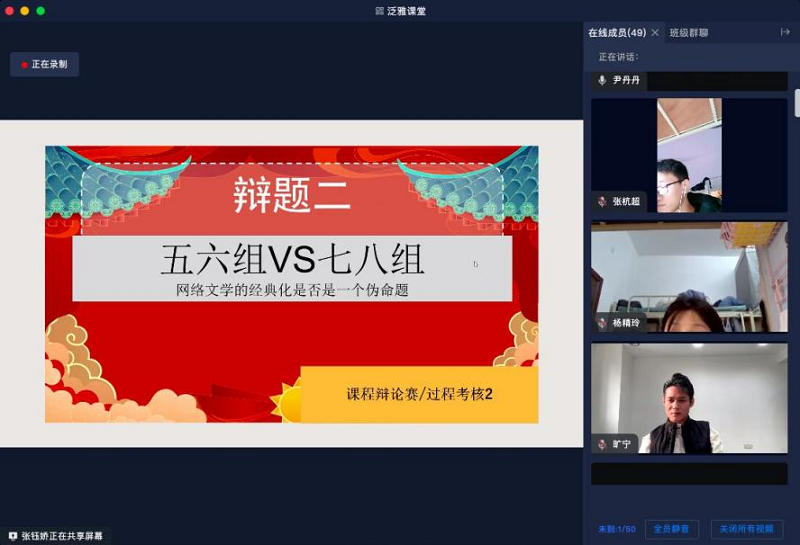 《网络文学》是数字艺术学院网络与新媒体专业的一门专业核心课程,本次课程辩论赛以20级网媒1、2、5、6班为专家试点,结合本学期的知识内容与热门学术话题确定辩论命题,秉承“以学生为中心”的教学理念,由学生自主制定比赛规则及具体流程,并参与辩论。学生在此次课程辩论赛中表现积极主动,对专家评委进课堂和辩论赛这样的新形式非常认可和喜爱。学生们充分发挥了团队及自我优势,辩论过程中辩手旁征博引、妙语连珠,团队之间配合默契;赛场氛围紧张激烈,双方选手你来我往,侃侃而谈;自由辩手也反应热烈,纷纷表示希望可以再次举办类似活动。每组辩论赛后,以彭玉沨老师、周莹冰老师为主的专家评委发挥榜样力量,针对辩手现场表现进行精彩点评,指出选手论辩的优缺点,并传授相应的辩论技巧,使学生们受益匪浅。本次课程实践在专家带动、教师辅助的合力之下,很好实现“专家进课堂,精准指导促提升”的目的。