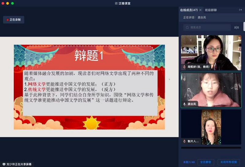 本网讯(文/图 数字艺术学院 周熙妍)为践行党的二十大报告中强调的“坚持科学的教育理念,教育要注重学用相长、知行合一”, 12月5日、6日,数字艺术学院20级网络与新媒体专业的《网络文学》课堂上,在新媒体系教师周熙妍的统筹安排下,同学们以课程辩论赛的形式完成了该门课程的第二次过程性考核。