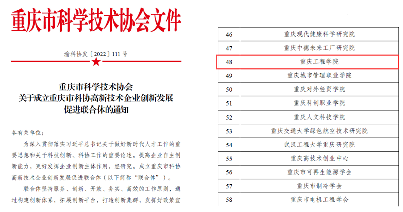 本网讯(文/图 科技处 李世毅)为全面贯彻落实学校办学理念,切实加强校企合作、产研合作,充分发挥学校学科和科研平台建设优势,突出专业特色, 优化资源配置,实现资源共享,通过学校积极协调申请,近日获批重庆市科协高新技术企业创新发展促进联合体(以下简称联合体)首批成员单位。