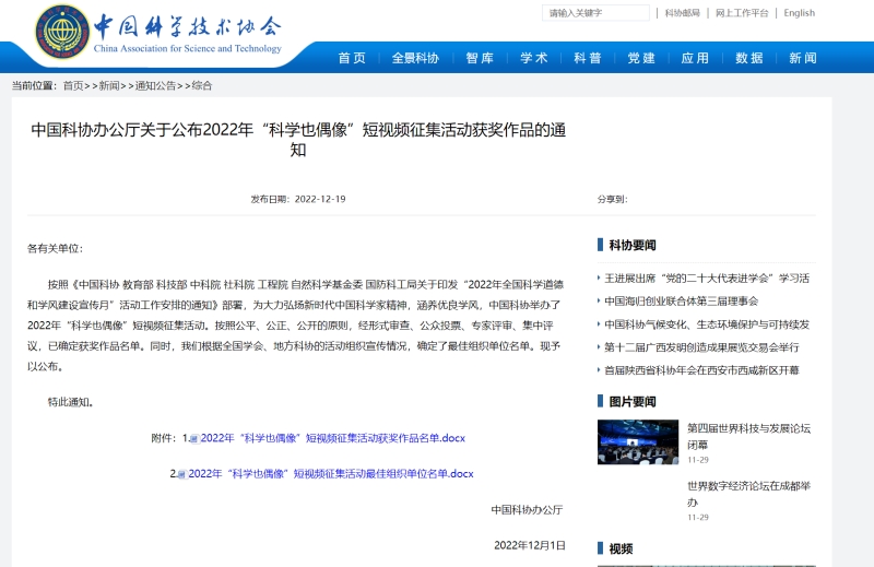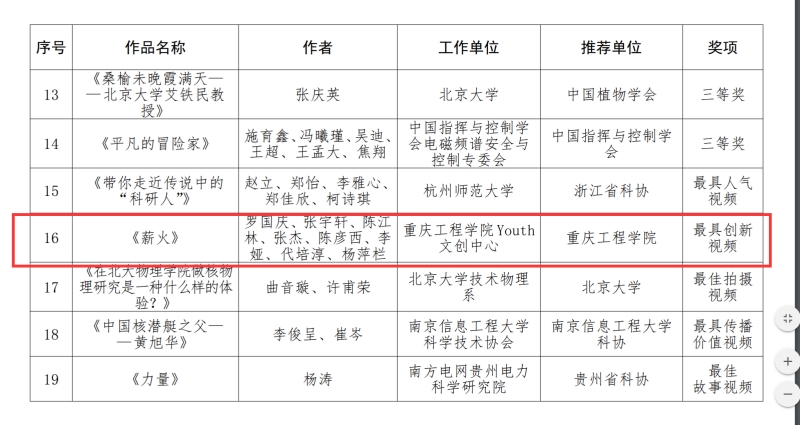本网讯 (文/图 校团委 黄涛、科技处 李世毅)近日,根据中国科协办公厅公布2022年“科学也偶像”短视频征集活动获奖作品的通知,我校Youth 文创中心推荐作品《薪火》获得最具创新视频奖。