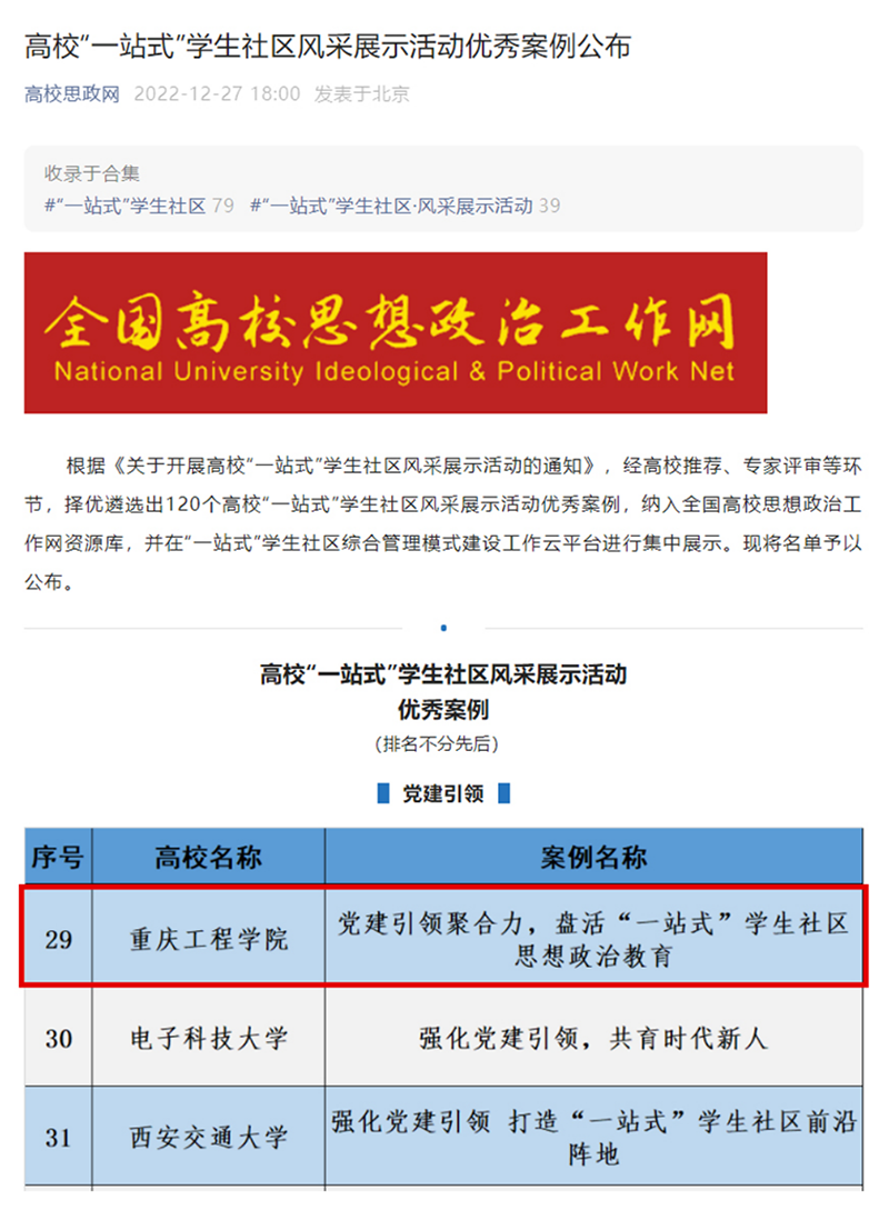 本网讯(文/图 学工部 李鹏)近日,教育部思想政治工作司公布120所高校“一站式”学生社区风采展示活动优秀案例名单,我校申报的党建引领类项目《党建引领聚合力,盘活“一站式”学生社区思想政治教育》被评为全国优秀案例,纳入全国高校思想政治工作网资源库,并在“一站式”学生社区综合管理模式建设工作云平台进行集中展示。
