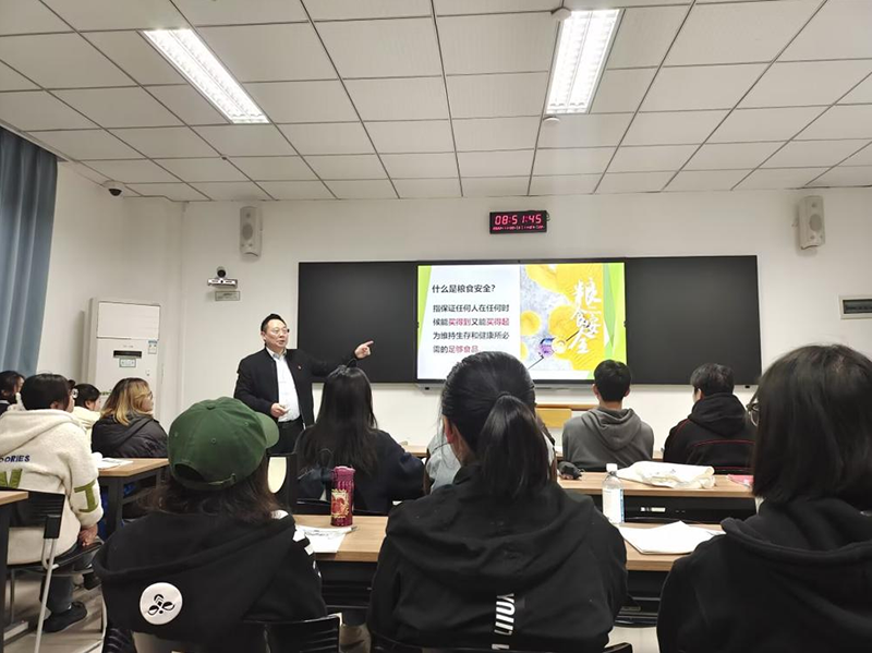 谭明术以《保障粮食安全的中国策》为题向21级机器人2班讲授思政课。通过展示新中国成立初期时的粮票、布票和肉票照片,谭明术从资源环境约束明显、结构性矛盾突出、粮食贸易危机加剧三个方面揭示了我国粮食安全所面临的挑战,并表示过去,我国以占世界9%的耕地,6%的淡水资源,解决了占世界近1/5的人口吃饭问题,未来,只要我们始终坚持“自力更生,自己养活自己”,我们的粮食之基就会更牢靠,发展之基就会更深厚、社会之基就会更稳定。