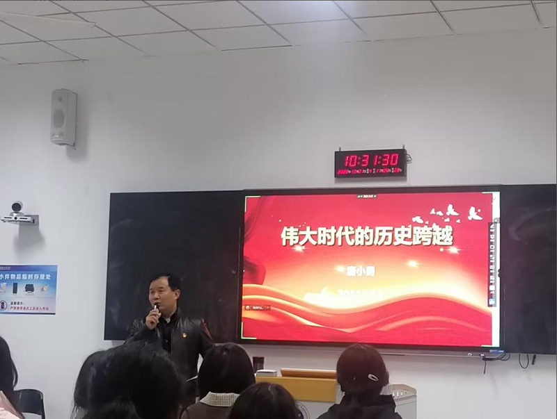 唐小勇以《伟大时代的历史跨越》为题在双桥校区向22级电商3班讲授思政课。中国特色社会主义进入新时代,取得一系列标志性成果,唐小勇从政治、经济、文化、社会和生态五个方面讲解党和国家事业取得历史性成就、发生历史性变革。面对机遇和挑战的新征程,我们必须坚定不移走好“必由之路”,掌握主动用好“有利条件”,“中国号”巨轮定能乘风破浪行稳致远。