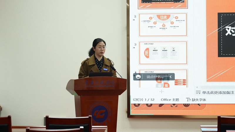 接下来,教务处处长杨倩作题为《对标对表找差距,凝心聚力抓落实》的主题报告。报告总结了2022年度人才培养顶层设计、教学建设工作、教学管理工作等本科教学工作中取得的成绩,深入分析了当前教学工作面临的形势和任务,指出存在的问题和不足。同时,从十一个方面对2023年的教学重点工作进行了部署,一是要持续优化人才培养方案;二是进一步加强案例库、项目库建设与使用;三是完善校内实习基地建设与管理;四是推进“工学交替”教学模式探索;五是继续推进专业建设与课程建设;六是加强教学质量监控;七是进一步加强教学规范的深入全面实施;八是推动基层教学组织、优秀教学团队建设;九是进一步提高教学管理人员的管理能力与水平;十是启动教学成果奖培育项目;十一是持续开展迎评工作。