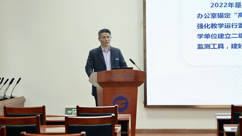 质管办主任赵钰作题为《2022年度教学质量监控工作报告》的主题报告。报告从基本情况、工作成效、存在问题、工作打算四个部分反映了2022年度教学质量监控工作。教学质量管理办公室锚定“高质量一次性通过合格评估”目标,坚持督导与评价并重、监测与评估一体、强化教学运行监控、施行“纵向到底、横向到边”的2+X教学质量保障体系,守住教学“生命线”,发挥“倍增器”的作用。