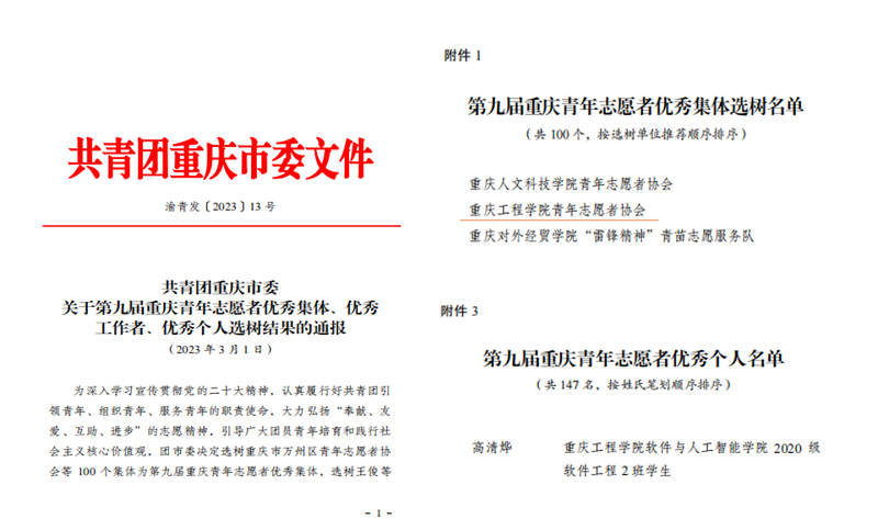 本网讯(图/文 校团委 刘琳靖)为深入学习宣传贯彻党的二十大精神,认真履行好共青团引领青年、组织青年、服务青年的职责使命,大力弘扬“奉献、友爱、互助、进步”的志愿精神,引导广大团员青年培育和践行社会主义核心价值观,重庆市团委决定选树“第九届重庆青年志愿者优秀集体及个人”予以表彰。我校青年志愿者协会及软件与人工智能学院20级高清烨同学,通过层层评选,最终分别荣获“第九届重庆青年志愿者优秀集体”、“第九届重庆青年志愿者优秀个人”荣誉!
