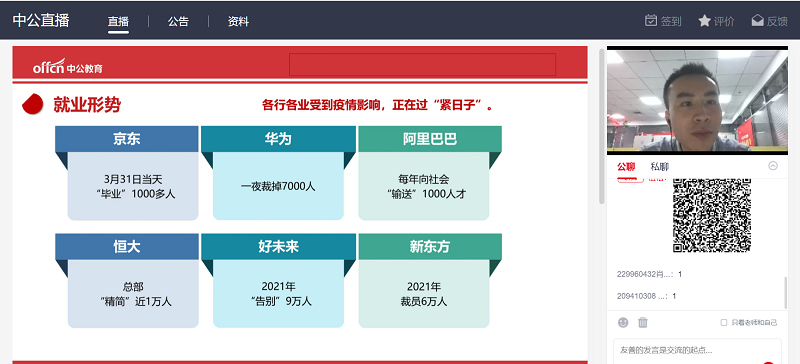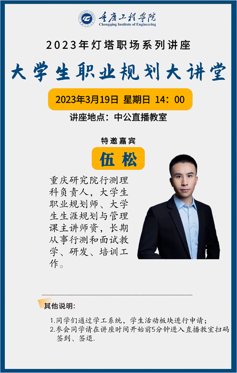 本网讯(文/图 就业指导中心 叶秋清)为进一步增强我校大学生的职业生涯规划和未来发展意识,提身自我认知水平和职业探索能力,学校就业指导中心于3月19日在中公直播平台开展“大学生职业生涯规划大讲堂”专题讲座。本次讲座邀请了重庆研究院行测理科负责人伍松老师。全校3000多名学生参与了此次线上活动。