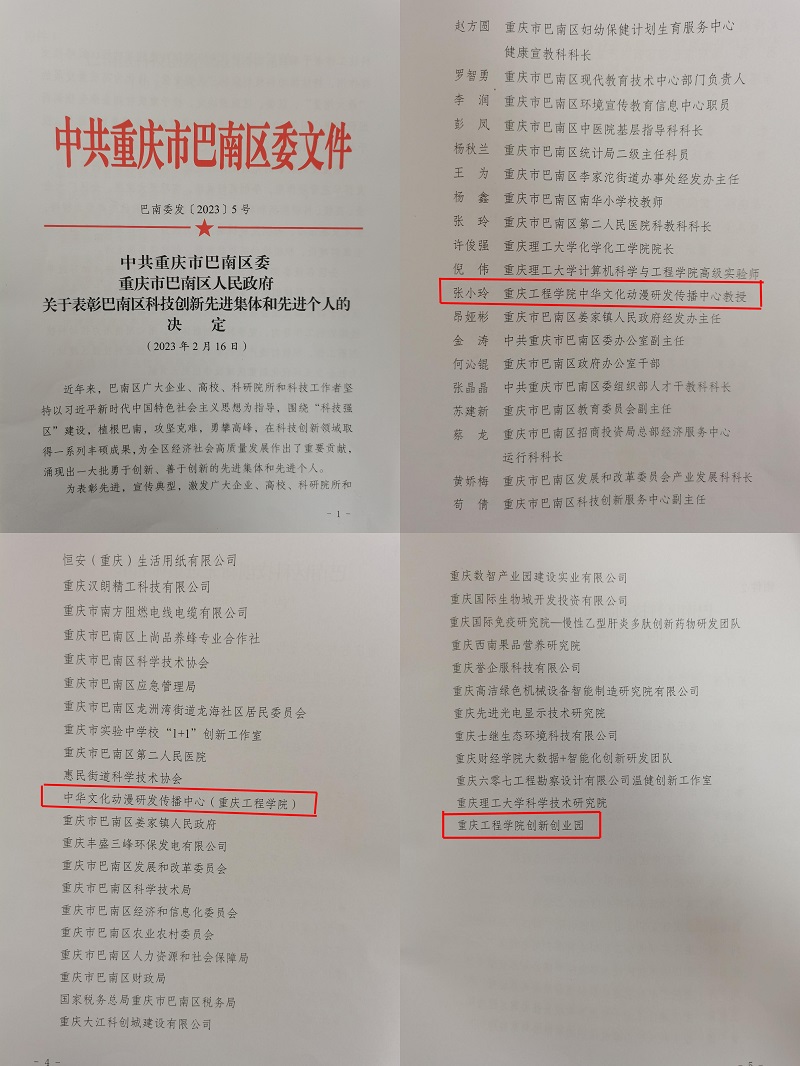 本网讯(文/图 科技处 李世毅)近日,中共重庆市巴南区委、巴南区人民政府印发了《关于表彰巴南区科技创新先进集体和先进个人的决定》,我校中华文化动漫研发传播中心和创新创业园获得巴南区科技创新先进集体称号,张小玲教授荣获科技创新先进个人称号。