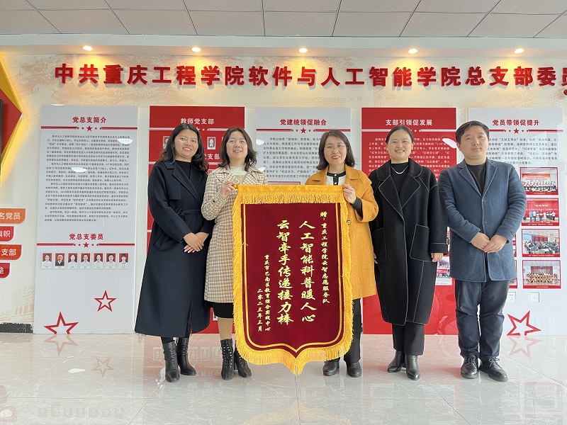 本网讯(文/图 软件与人工智能学院 王惠俊)3月27日,巴南区教育综合实践中心副主任(副校长)鲜王艳、课程部主任邓常梅来访我校,与软件与人工智能学院党总支书记刘子菱、分团委书记王惠俊、学生科长李阳一起展开交流。双方就前期所开展的专业实践和志愿服务活动进行总结,并就下一阶段合作方向和内容展开讨论。对方充分肯定了我校学生立足专业发展,通过专业社团进课堂,面向中学生开展编程技术、人工智能、虚拟现实技术、游戏开发创作等信息技术方向的启蒙课程和实践活动。随后,实践中心还向学校赠送锦旗,表达感谢。