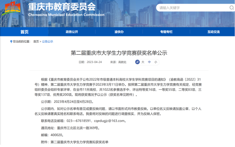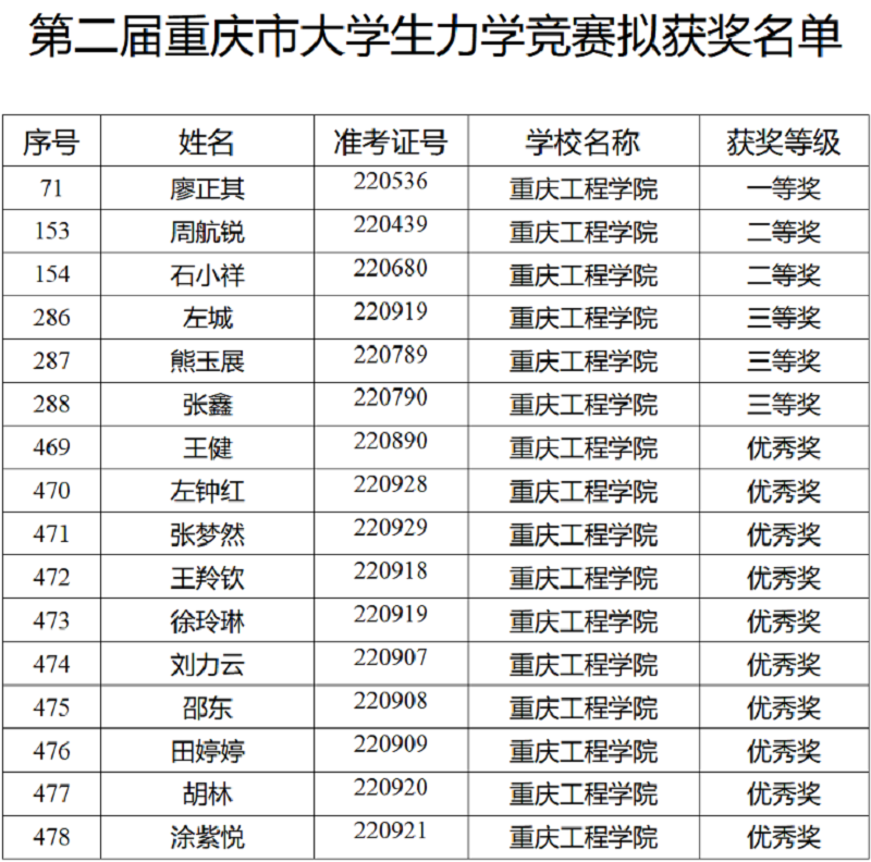 据悉,第二届重庆市大学生力学竞赛由重庆市教育委员会主办,重庆力学学会指导,重庆交通大学承办。全市共来自重庆大学、西南大学、重庆邮电大学等11所高校的1022名本科生、研究生和大中专生参赛,共评选出特等奖16项,一等奖55项,二等奖83项,三等奖137项,优秀奖200项。本赛事每两年举办一次,由重庆市教育委员会主办,重庆力学学会指导,旨在考察学生综合运用大学物理、理论力学和材料力学等课程的基础理论,建立力学模型和解决实际问题的能力。