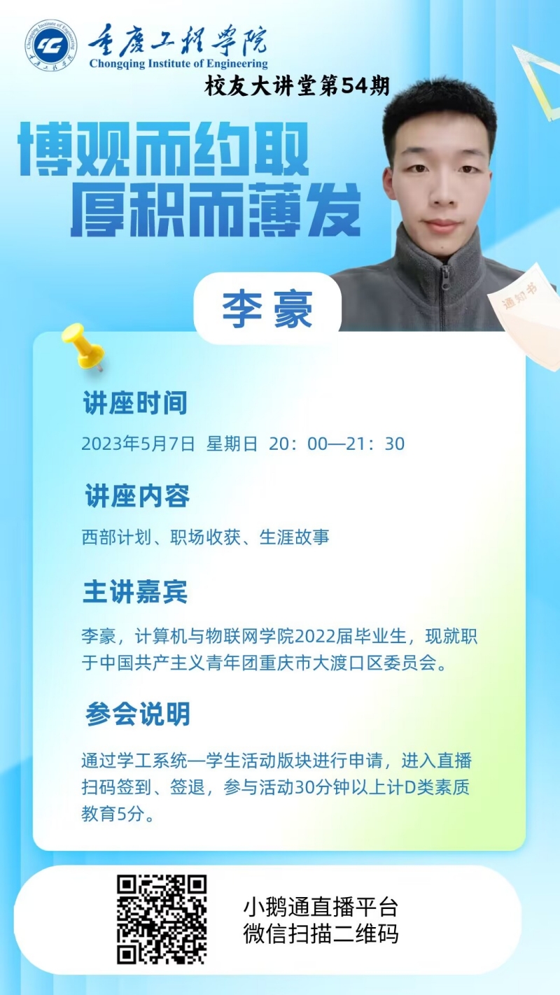 本网讯(文/图 就业指导中心 叶秋清)为帮助同学们了解西部计划,树立正确的就业择业观,做好大学生涯规划,学校就业指导中心于5月7日在小鹅通直播平台举办第54期校友大讲堂“博观而约取,厚积而薄发”主题交流活动,由计算机与物联网学院2022届毕业生李豪同学主讲,3000多名同学参加了此次线上活动。