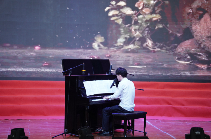 最令人印象深刻的要数双桥校区杨双溢老师演唱的《我的美丽》和通识学院孙洪禛老师演唱的《听见下雨的声音》。“指尖 旋转 萦绕 耳边”,杨双溢老师和她的舞伴配合默契,婉转的歌声中,丝巾随舞者的跳动而飘舞,两位老师给大家带来了一场绚烂的“话剧”表演,表演结束后,老师的歌声依旧萦绕耳边,久久回响。有着“重工钢琴王子”称号的孙洪禛老师,一袭白衬衫,优雅端正地坐在钢琴前弹唱,跳跃的琴键,婉转的吟唱,似将大家带入了一场绝佳的“演唱会”现场,无数同学为老师欢呼呐喊。