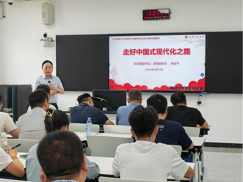 本网讯(文/图 软件与人工智能学院 宁丽丽)为深入开展学习贯彻习近平新时代中国特色社会主义思想主题教育,5月31日中午,党委副书记、常务副校长张业平深入软件与人工智能学院以“走好中国式现代化之路”为题讲授主题教育专题党课。党课由党总支书记刘子菱主持,学院党政班子成员及全体教师党员70余人参加学习。