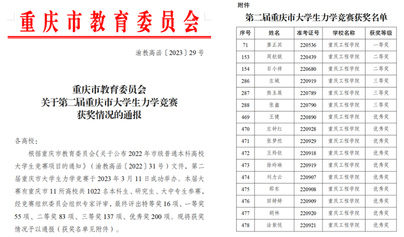 据悉,第二届重庆市大学生力学竞赛由重庆市教育委员会主办,重庆力学学会指导,重庆交通大学承办。全市共来自重庆大学、西南大学、重庆邮电大学等11所高校的1022名本科生、研究生和大中专生参赛,共评选出特等奖16项,一等奖55项,二等奖83项,三等奖137项,优秀奖200项。本赛事每两年举办一次,由重庆市教育委员会主办,重庆力学学会指导,旨在考察学生综合运用大学物理、理论力学和材料力学等课程的基础理论,建立力学模型和解决实际问题的能力。