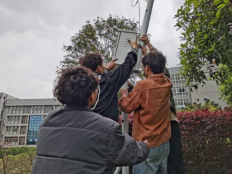 孟夏之日,万物并秀。位于南温泉花溪河畔的重庆工程学院植被环绕、绿草茵茵,月季花开得尤为艳丽。接受采访时,李波正和一群学生在学校五教前面的小山坡上忙碌着,“现在大屏上空气、土壤的数据信息都在实时更新,可是手机上没有相应显示,应该是传输系统出现了BUG,谢有源同学你来找找原因。”趁着学生检修设备,李波指着满目绿色:“六教前广场的花花草草,都是用我们智慧园林系统浇灌的。”