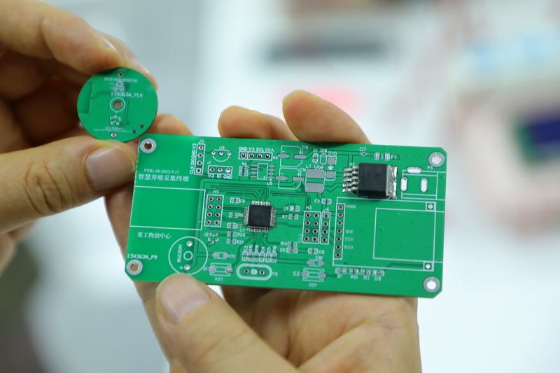 “这个是我们专业在智慧养殖方面的探索”,李波拿着小小的智能耳标介绍道:“这个圆形套件是直接贴在黑山羊的耳朵上,可以对黑山羊的生理特征、体温等进行监测,数据传输到方形的采集终端经网络传输到后台服务器,便可以对山羊健康情况做分析。”在李波和同学们的努力下,重庆市大足区凯远农业发展有限公司生态园里的黑山羊都戴上了这个小“耳饰”。