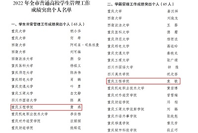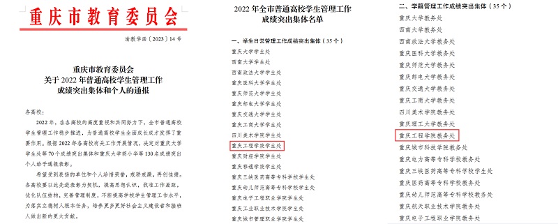 本网讯(文/图 党委宣传部)近日,重庆市教育委员会下发通知,对2022年度普通高校学生全面成长成才发挥重要作用、成绩突出的集体和个人给予通报表彰。我校学生处获学生管理工作成绩突出集体,教务处获学籍管理工作成绩突出集体,我校学生处黄燕、教务处袁敏还分别获得学生日常管理工作成绩突出个人和学籍管理工作成绩突出个人称号。
