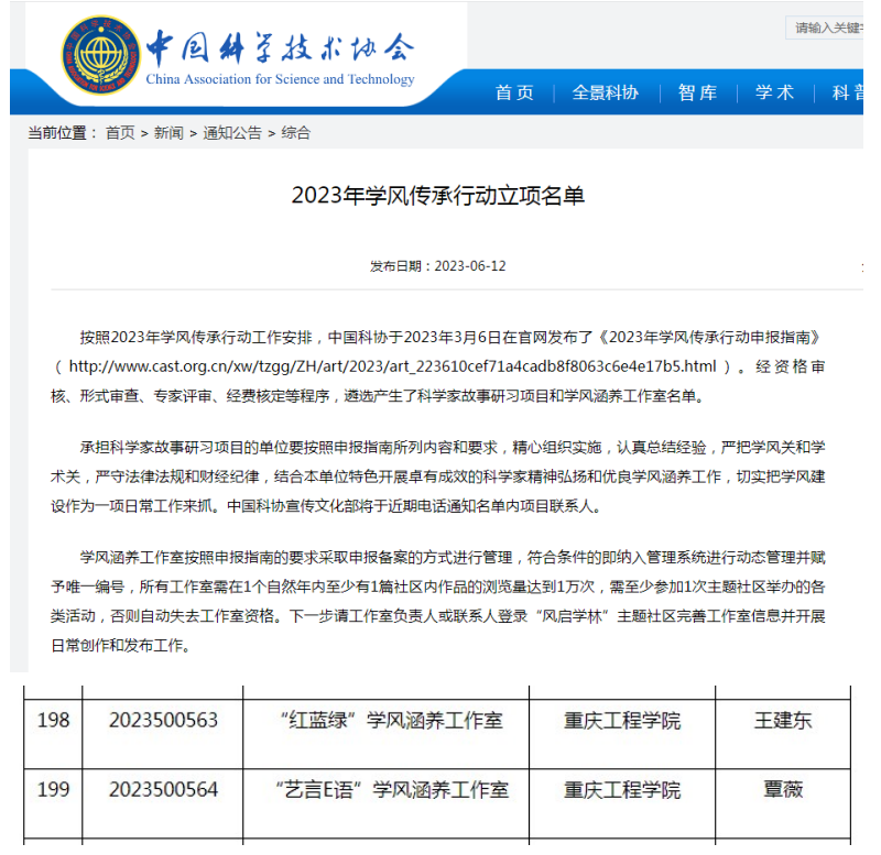 本网讯(文/图 科技处 李世毅)近日,中国科学技术协会官网发布了“2023年学风传承行动立项名单”,我校组织申报的“红蓝绿”学风涵养工作室、“艺言E语”学风涵养工作室2个项目成功获得立项,这也是我校首次在中国科学技术协会获得项目立项。