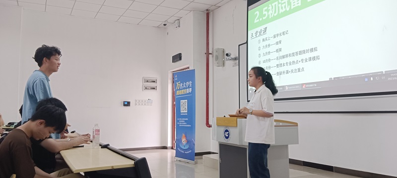 本网讯(文/图 就业指导中心 叶秋清)为帮助同学们尽早明确考研方向,熟悉备考流程,掌握考研经验,科学合理的做好职业生涯规划,学校就业指导中心于6月14日下午在第六教学楼201教室举办了第56期校友大讲堂,特邀请成功上岸北京师范大学的管理学院2023届毕业生李懿远主讲,200多名同学参加了本次线下交流活动。