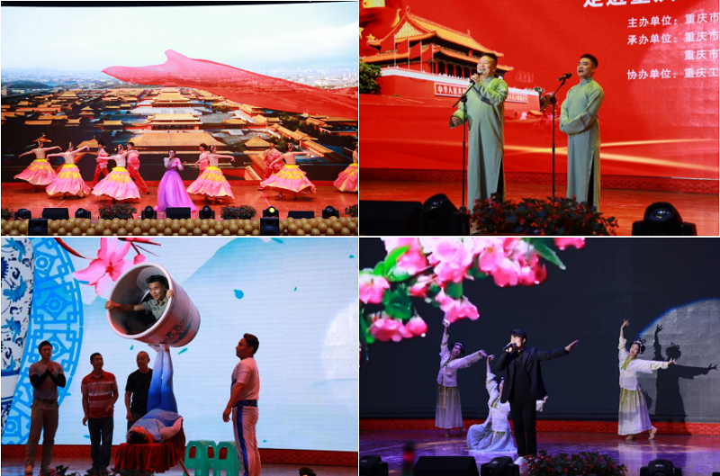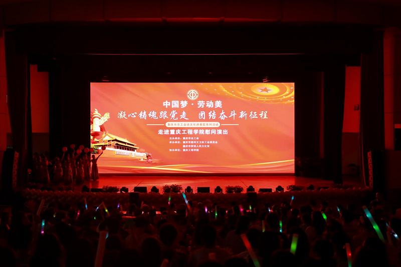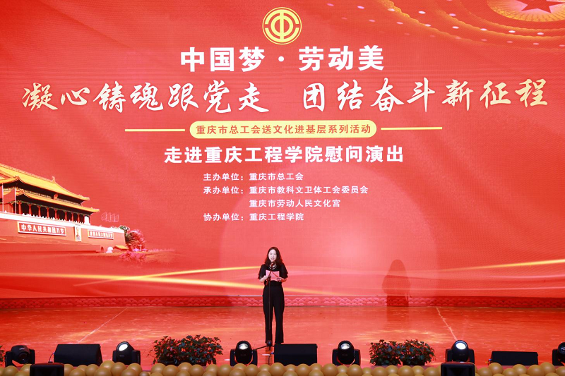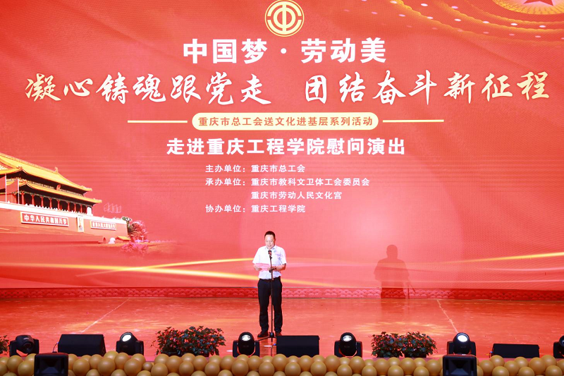 本网讯(文/校工会 邓俊梅 图/大学生记者团 盘丽珍)6月14日下午,由重庆市总工会主办、教科文卫体工会和市文化宫承办的“中国梦.劳动美 凝心铸魂跟党走 团结奋斗新征程”,送文化进基层系列活动在学校南泉校区学术报告厅举行。市教科文卫体工会常务副主席张晋,副主席彭燕玲,市文化宫副主任喻霞,学校党委书记、督导专员谭明术,党委副书记常务副校长张业平,副校长王琼花,党委副书记兼工会主席唐小勇,副校长王建东出席活动。学校师生代表共计1000余人参加活动。