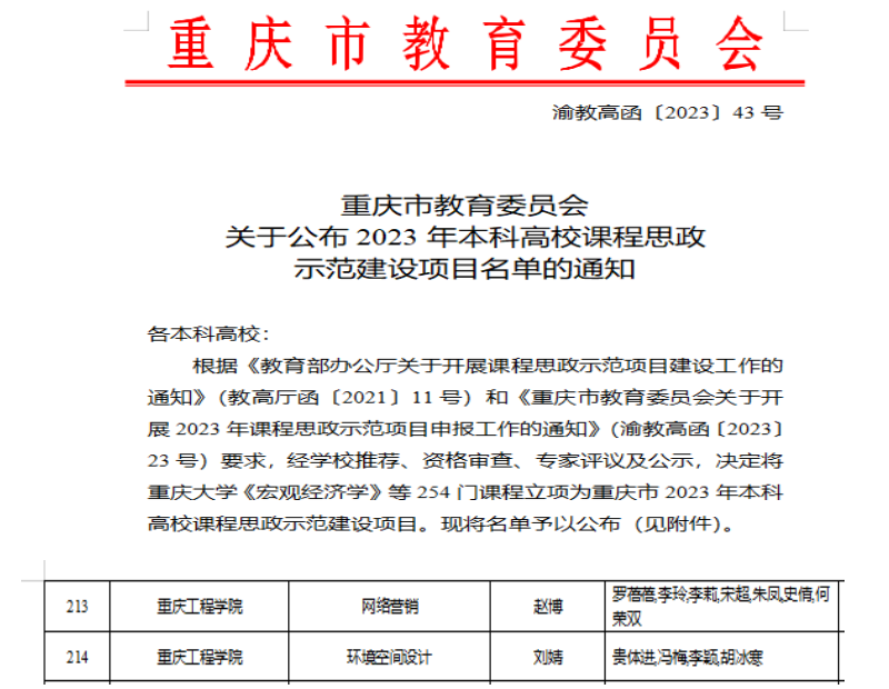 本网讯(文/图 教务处 郎俊霞)根据《教育部办公厅关于开展课程思政示范项目建设工作的通知》(教高厅函〔2021〕11号)和《重庆市教育委员会关于开展2023年课程思政示范项目申报工作的通知》(渝教高函[2023]23号)要求,近日,重庆市教育委员会公布了2023年本科高校课程思政示范建设项目名单,经学校推荐、资格审查、专家评议及公示,决定将254门课程立项为重庆市2023年本科高校课程思政示范建设项目。其中我校管理学院老师赵博带队申请的《网络营销》、建筑工程学院老师刘婧带队申请的《环境空间设计》两门课程成功立项为重庆市2023年本科高校课程思政示范建设项目。