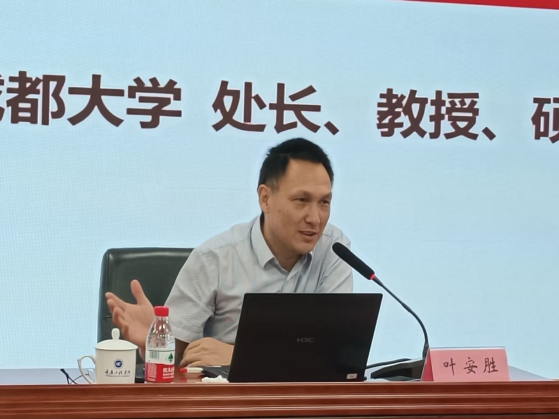 8月30日上午,成都大学教务处处长、硕士生导师叶安胜教授以《全面把握高等教育发展新形势,全面落实立德树人根本任务 ——以成都大学为例》为题,对新时代的高校教学管理、人才培养等做了深入全面的解读。叶教授从人才培养根植学校高速发展沃土、全面把握新时代本科教育新形势、九大教学工程确保育人质量提升、绩效改革分配方案的探索与实践、只争朝夕砥砺前行实现人生价值五个方面,结合成都大学工作实际,进行了深入浅出的分析阐释,为学校未来进一步精细化管理,提高教学科学性、规范性提供了借鉴。