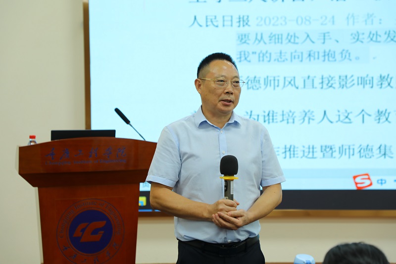 谭明术以“坚守三尺讲台,潜心教书育人”为题,带领大家学习了建设教育强国第五次集体学习要点、习近平总书记系列讲话精神及新时代高校教师职业行为十项准则。他强调,作为新时代高校教师,要牢记四有好老师和四个引路人的内涵,切实用在教育教学实践中;要谨记习近平总书记对广大教师提出的“不忘立德树人初心,牢记为党育人、为国育才使命”殷切希望,要树立“躬耕教坛、强国有我”的志向。