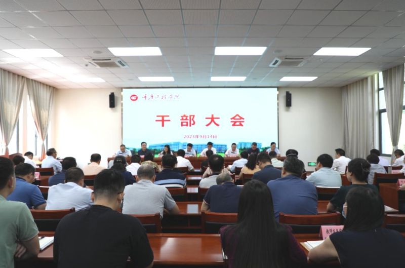 本网讯(文/图 党委宣传部)9月14日上午,我校召开干部大会宣布新一任党委书记、督导专员任免决定。中共重庆市委教育工委组干处处长江鹏、副处长姚文平,重庆第二师范学院副校长吴海霞,党委委员、组织部部长严国华出席,重庆工程学院全体校领导、中层干部参加。会议由学校党委副书记、常务副校长张业平主持。