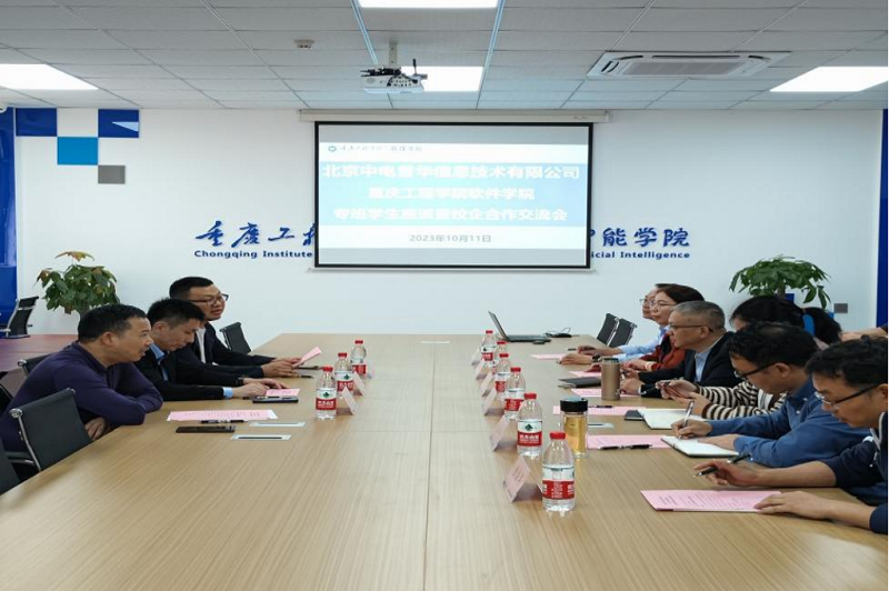 中电普华信息技术有限公司咨询事业部总经理王昊,重庆正大软件(集团)副总裁、重庆正大华日软件有限公司总经理马国盛,重庆正大华日软件有限公司副总经理夏才云;学校教务处处长杨倩、副处长许欢欢,软件学院院长周龙福、副院长李华平,大数据与人工智能学院院长助理周勇,SAP、JAVA专班班导师陈浩军以及全体专班学生参加了座谈交流会。会议由软件学院院长周龙福主持。