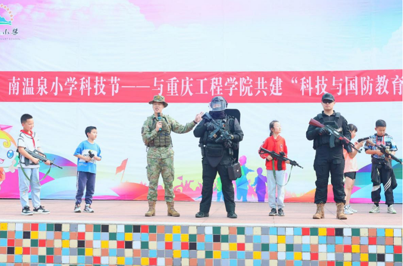 活动在庄严的升旗仪式后拉开帷幕,鲜艳的五星红旗缓缓上升,800多名小学生坚定地看着重庆工程学院的哥哥姐姐将国旗升起。升旗仪式后由大学生记者团的同学给南温泉小学全体师生简要介绍了民用无人机在实际应用与功能,紧接着由国旗护卫队的退役大学生士兵郑俊林、李杰为同学们简要讲解了关于无人机在军事领域的应用及现代军事战争中对无人机的反制方法,科普了人防常识,激起同学们对国防科技的热爱。最后,又用我校自带的“枪械”模型给同学们进行了轻武器常识的介绍,并选代表开展了水弹枪射击体验。