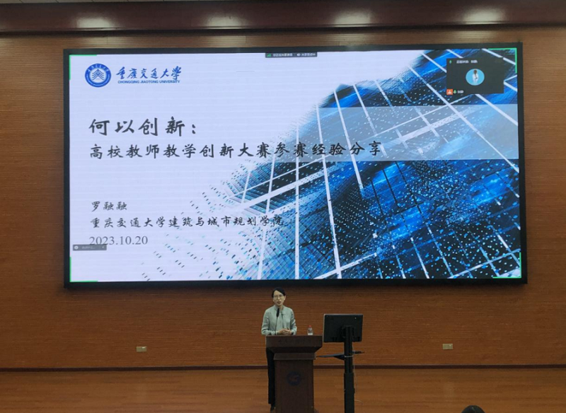 本次活动邀请到了重庆交通大学建筑与城市规划学院罗融融副教授担任主讲专家。罗融融以“何以创新”为题,结合自身参赛经验,从“对教学创新大赛的认识和解读”“参赛成果的凝练、组织、呈现”“参赛总结、反思及再参赛可改进的地方”三个方面向我们分享了备赛中需注意的要点、痛点及需避的“坑”等备赛经验。分享完经验后,罗融融用叶圣陶的“教是为了不教”,阐释了课程创新,教学创新最终目的是驱动学生自主学习、深度学习的能力;作为高校教师应积极参加教学创新大赛,实现以赛促教,以赛促学。答疑环节,罗融融对参训教师提出的课程思政可能的创新点、目标可度量是否可算创新点等问题进行了解答。