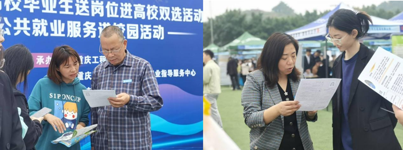 数字艺术学院院长杨开富(左)、党总支书记徐小辉(右)与学生现场沟通面试情况