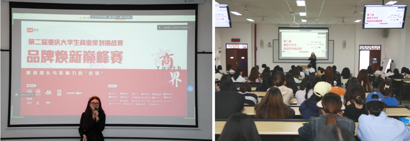 据悉,商界传媒集团是中国最具影响力的财经媒体经营集团之一。自1994年创立以来,发展成为囊括电子商务、游戏制作、数字出版、移动互联网营销、企业资讯服务等业务模块的媒体产业集团。讲座上,程馨瑶就商界传媒集团旗下,第二届重庆大学生商业策划挑战赛——品牌焕新巅峰赛做了有关介绍,针对该比赛的性质、以往概况、具体要求等方面,进行了生动精彩的分享。