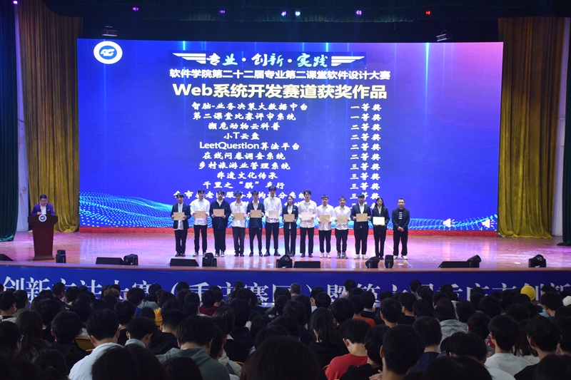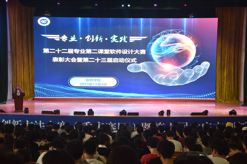 本网讯(文/图 软件学院 李阳)为积极引导师生以赛促学共成长,持续深入开展专业竞赛和创新创业活动,11月3日,软件学院在学术报告厅举办第二十二届专业第二课堂软件设计大赛表彰大会暨第二十三届启动仪式。会议由学校老师李东芝主持,学院院长周龙福、党总支书记刘子菱、副院长李华平及学院2021和2022级专业班导师、辅导员及全体同学1000余人共同参会。