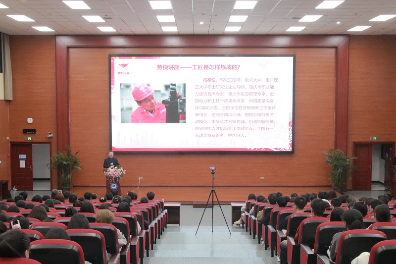 本网讯(图/文 校团委 易云丽)为大力弘扬劳模精神、劳动精神、工匠精神, 11月7日晚我校邀请“中国好人”“全国五一劳动奖章”获得者冯德伦老师在南泉校区7807报告厅为同学们开展了题为“工匠是怎样炼成的”专题讲座。各二级学院分团委书记、副书记、辅导员代表及300余名同学现场参与,8700余名同学通过观看直播线上参与。
