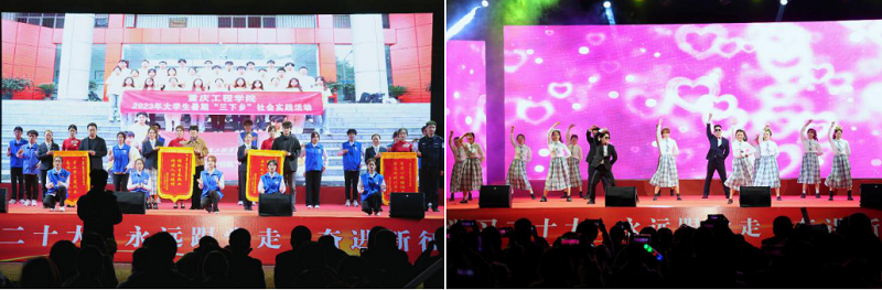 学校青年志愿者团队也带来手语操表演《青年志愿者之歌》,让现场的观众们深切的感受到“蓝色引路人”的热心、友善、奉献。同时来自双桥社区居委会、双桥敬老院、茅店社区居委会、通桥派出所及大足区中心血库结对共建单位为我校志愿者团队送来锦旗;坚持立德树人使命,为学生保驾护航,提供全方位帮助与关怀的重工辅导员队伍为大家带来了舞蹈《爱你》,引起现场师生的一阵阵欢呼喝彩。