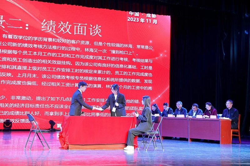 赛前,我校参赛选手在指导教师石千羽和靳银银的悉心指导下积极备赛,参赛选手充分运用精创云平台进行实战模拟,不断总结经验,深入研讨竞赛方案。比赛中,我校选手对所选案例进行深入剖析,反复练习绩效面谈的全过程,多次修改、完善台词、打磨细节,在情景模拟中沉着冷静,精准地回答了评委的提问,最终获得了一等奖的好成绩。