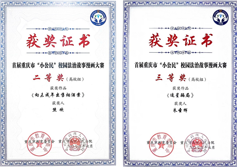 此次比赛设有小学组、中学组、高校组。本次活动作为未成年人保护和预防青少年犯罪工作的重要活动,提倡用漫画形式宣传法律知识,弘扬法治精神,推进未成年人司法保护、学校保护和犯罪预防。此次获奖作品将在“重庆教育”“重庆高院”微信公众号、市教委官网、重庆法院网、重庆智慧教育等网站上公布,同时择优选取部分作品在市级主流媒体上进行宣传展播。我校数字艺术学院熊欢同学作品《向未成年出售烟酒案》荣获高校组二等奖。建筑工程学院朱圣辉同学作品《追星骗局》荣获高校组三等奖。