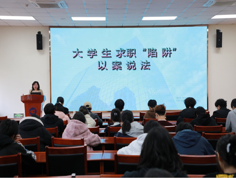 文律师围绕求职就业主题,从常见劳动法律知识入手,就大学生求职就业存在的常见招聘陷阱、求职过程中的法律风险防范、法律风险的事后救济及应对等各类法律问题进行了深入浅出的讲解。她通过具体事例提醒同学们警惕人才中介陷阱、职业培训陷阱、薪酬陷阱等常见的招聘陷阱,并分析了招聘陷阱产生的原因,提供了解决的途径和有效应对方法。针对大学毕业生社会经验不足,法律知识欠缺,尤其是对劳动合同法相关知识缺失的实际,她建议同学们要加强就业法律知识储备,提高是非的辨别能力和自我保护的能力。