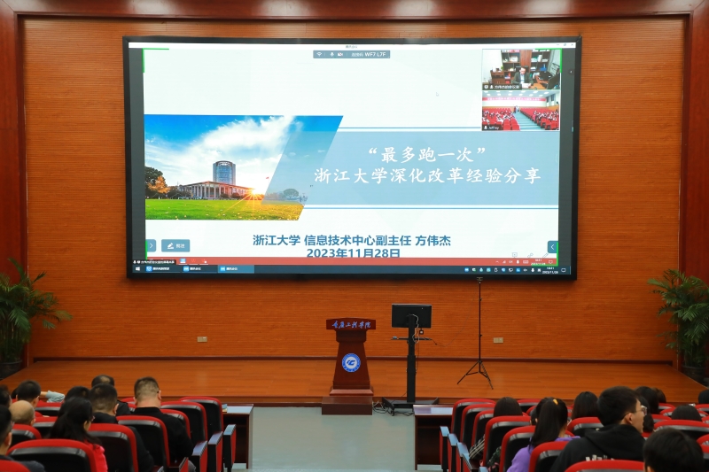 办好小事,就是大事。为提升职能部门办事效率,让数据多跑路,师生少跑腿,28日晚,学校邀请浙江大学信息技术中心副主任方伟杰以“最多跑一次”为题为在场教职员工进行线上讲座,他从浙江省“最多跑一次”改革工作、高校一站式服务中心介绍、浙江大学“最多跑一次”改革实践三个方面为大家详细地分享了深化改革经验及实践成果,并与现场老师进行了互动交流。
