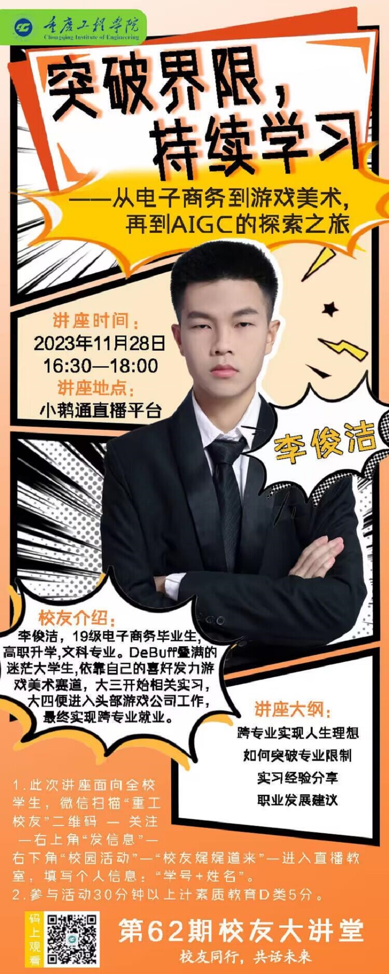在讲座中,李俊洁首先分享了自己以梦为马,坚持自学,将自己的专业能力从电子商务拓展到游戏美术,再到AIGC领域的学习经历。接着,他介绍了自己的求职经验和技巧,分享了职场新人的生存体验和成长收获。