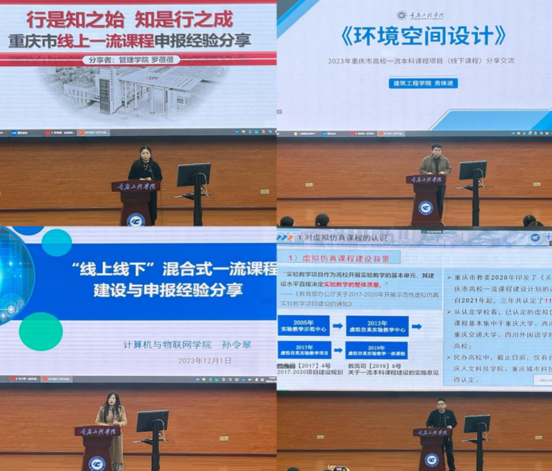 首先, 2023年重庆市一流本科课程负责人代表罗蓓蓓、贵体进、孙令翠、林俊分别分享了申报经验、注意事项,以及个人感悟。线上课程代表罗蓓蓓陈述了线上课程建设过程、申报要求、评审指标,提出要尽早开始在各大平台跑数据,线上课程视频呈现的每一句话都必须要有相应材料支撑;线下课程代表贵体进老师主要从课程简介、培育与申报过程、自我感悟三方面讲述,提出一流课程一定要融入课程思政,并且要紧扣国家政策与学校办学定位,层层推进,有具体支撑;混合式课程代表孙令翠从课程建设前期准备、建设过程,到申报要点、申报误区进行陈述,把国产操作系统成果和实践转化为思政元素,融入教学内容,实现课程育人;虚拟仿真实验课程代表林俊对课程建设背景、建设历程、心得体会和课程后续规划进行讲述,并希望持续改进之后,实现“虚实”结合、“理实”融合、资源开放共享。在分享过程中,四位老师都反复强调了一流课程“两性一度”的重要性。