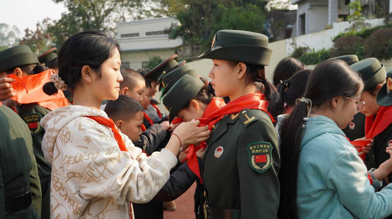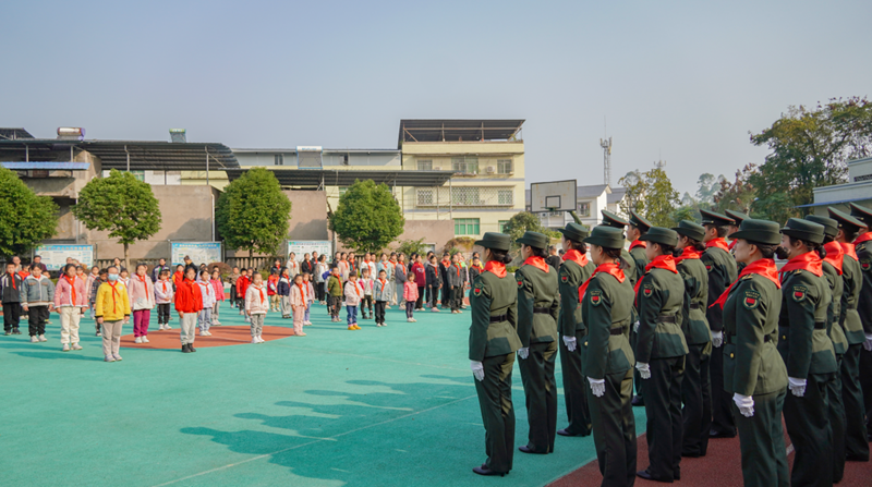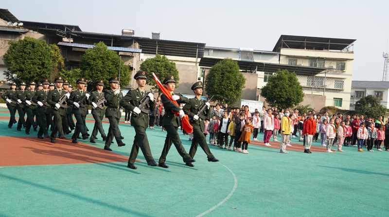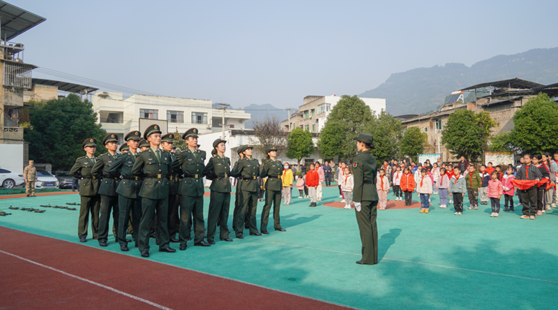 本网讯(文/图 武装部 朱文韬)近日,我校国旗护卫队受邀赴巴南区接龙镇光彩小学为校园学子带来了一次别出新意的国防教育活动。接龙镇碑垭村党支部书记、光彩小学校长、巴南区武装部相关同志出席了本次活动。