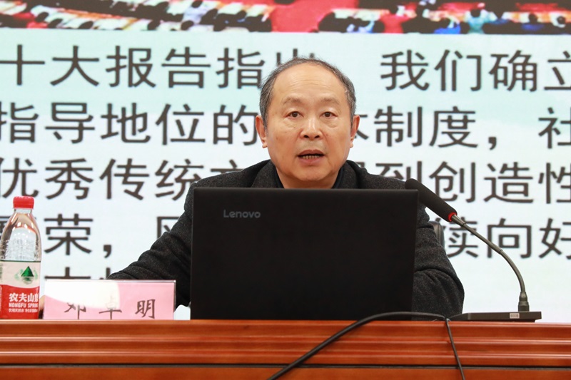 会上,重庆师范大学教授、西南大学博士生导师、国务院政府特殊津贴获得者,原重庆师范大学党委书记邓卓明从党对意识形态工作全面领导的强化、马克思主义在意识形态领域指导地位的彰显,意识形态工作责任制的全面落实,全社会凝聚力和向心力的提升五个方面为与会人员讲解了新时代我国意识形态领域形势的转变。紧接着,我校党委职能部门负责人、党总支书记、专职组织员、思政教师、政治辅导员代表从五个维度开展“五说”活动。他们各自围绕不忘立德树人初心,牢记为党育人、为国育才使命,结合自身工作岗位从“避误区、重实效”“举旗帜、强根本”“抓党建、打辅助”“筑堡垒、守思政、”“重关心、传正能”五个方面说出了对意识形态工作的理解及举措。