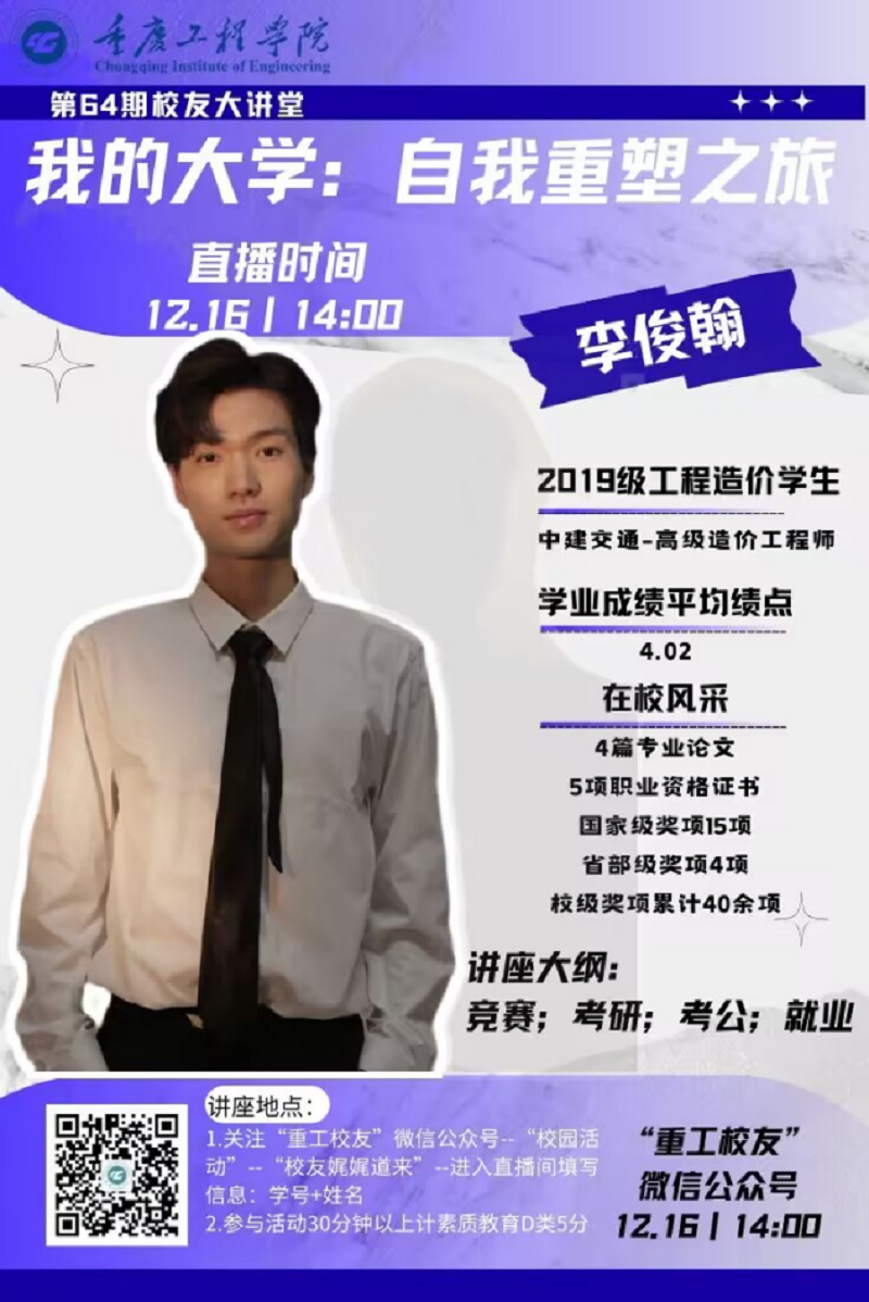 本网讯(文/图 就业指导中心 叶秋清)为进一步增进校友与母校的交流,发挥优秀校友的榜样和激励作用,开拓在校大学生的职业视野,我校举办了第64期“校友大讲堂”。本次活动邀请了优秀校友李俊翰学长做“我的大学:自我重塑之旅”主题分享,全校4000多名同学通过鹅直播参与了此次线上讲座。