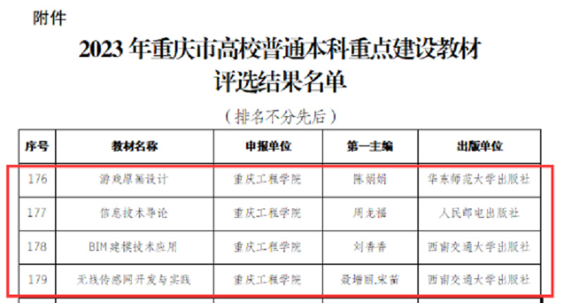 本网讯(文/图 教务处 张妍)近日,根据重庆市教育委员会《关于公布高等教育重点建设教材评选结果的通知》(渝教高函〔2023〕94号)文件获悉,我校《游戏原画设计》《信息技术导论》《BIM建模技术应用》《无线传感网开发与实践》入选重庆市高校普通本科重点建设教材。