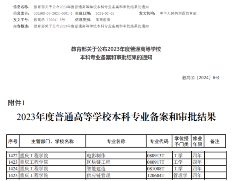 本网讯(文/图 党委宣传部)日前,教育部下发《关于公布2023年度普通高等学校本科专业备案和审批结果的通知》(教高函〔2024〕6号)文件,公布了2023年度普通高等学校本科专业备案和审批结果,本次备案、审批和调整的专业,将列入相关高校2024年本科招生计划。我校电影制作、区块链工程、智能建造、供应链管理4个本科专业成功获批。