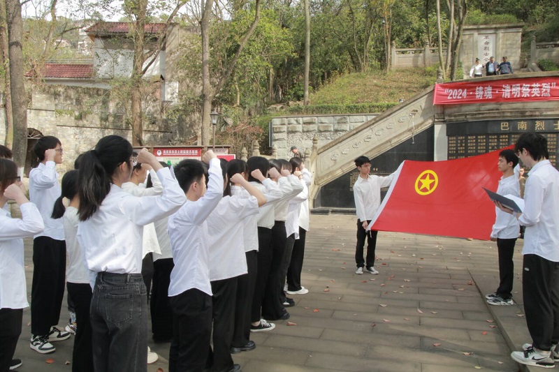 本网讯( 文/图 校团委 易云丽)清明是缅怀先烈、祭奠先烈、追思先烈的传统节日。为深入贯彻落实习近平总书记关于烈士褒扬工作重要指示批示精神,引导广大青年学生深切缅怀革命英烈的光辉事迹,弘扬爱国主义精神和民族精神,继承和发扬革命先烈的优良传统,3月29日上午我校团委组织30名青年学生代表于前往巴南区南泉革命烈士陵园开展“清明祭英烈 丰碑励青春”主题活动。伴着庄严的中华人民共和国国歌,同学们手持白菊,神情肃穆,庄重的歌声回荡在碑前,传递着中华儿女同仇敌忾、共赴国难的信念。