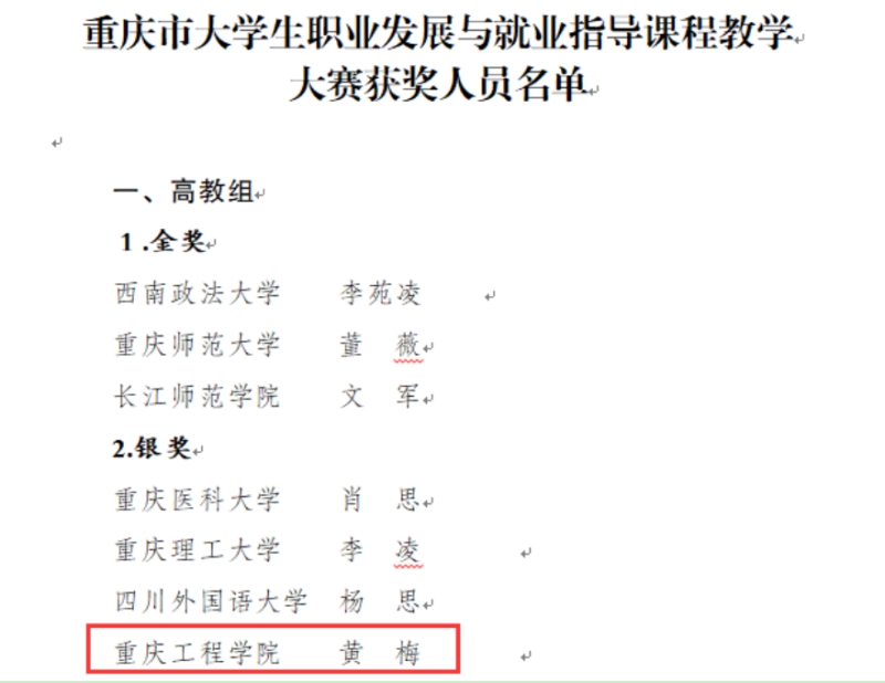 本网讯(文/图 就业指导中心 叶秋清)日前,重庆市教委公布了2024年全市大学生职业发展与就业指导课程教学大赛结果。全市共有42所高校职业发展与就业指导课程报名参赛。经专家评审,共评选市级金奖4名、银奖6名和铜奖10名。我校《大学生职业发展与就业指导》课程及其负责人黄梅老师荣获银奖。